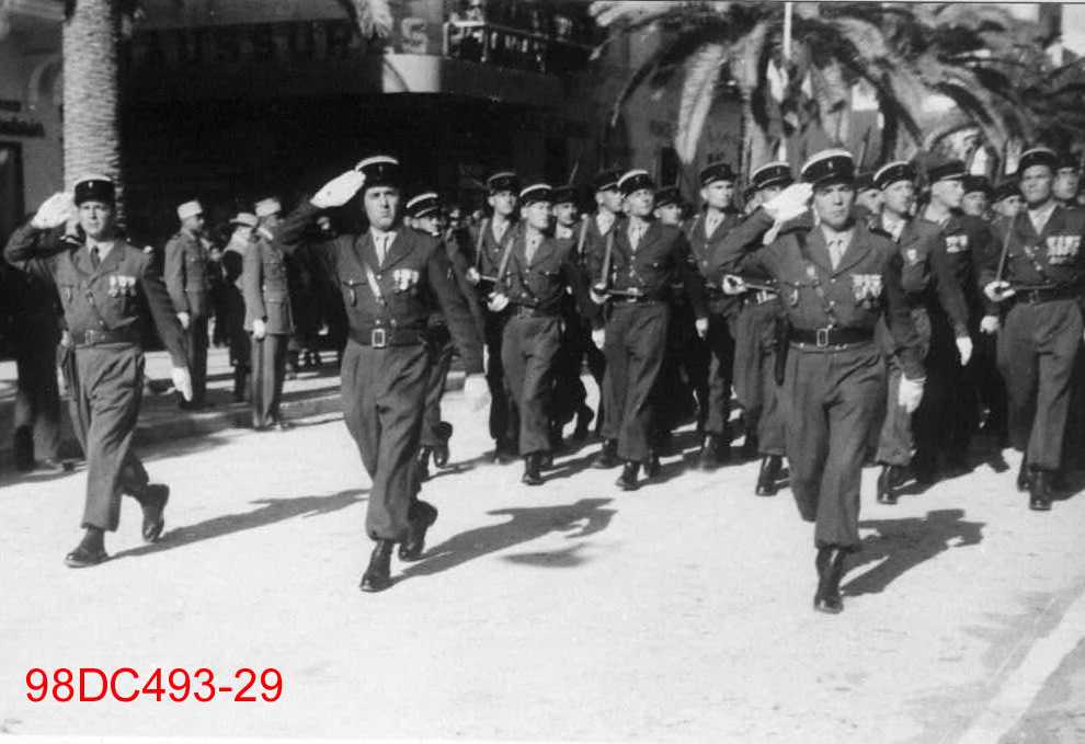 Les trois gradés devant saluent. Les troupes derrière défilent au pas.