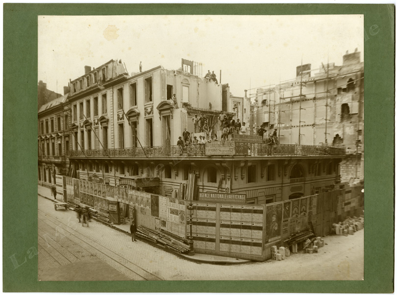 Démolition en deux étapes de l'immeuble occupé par le grand hôtel de France situé à l'angle de la rue Esprit-des-Lois et de la rue d'Orléans renommée rue Charles Lamoureux. L'entreprise de démolition est celle de Edmond Brouillaud domicilée rue Ambroise à Bègles. L'équipe de six ouvriers pose sous la marquise de l'entrée. Belle façade en pierre ouvragée de quatre nouveaux.