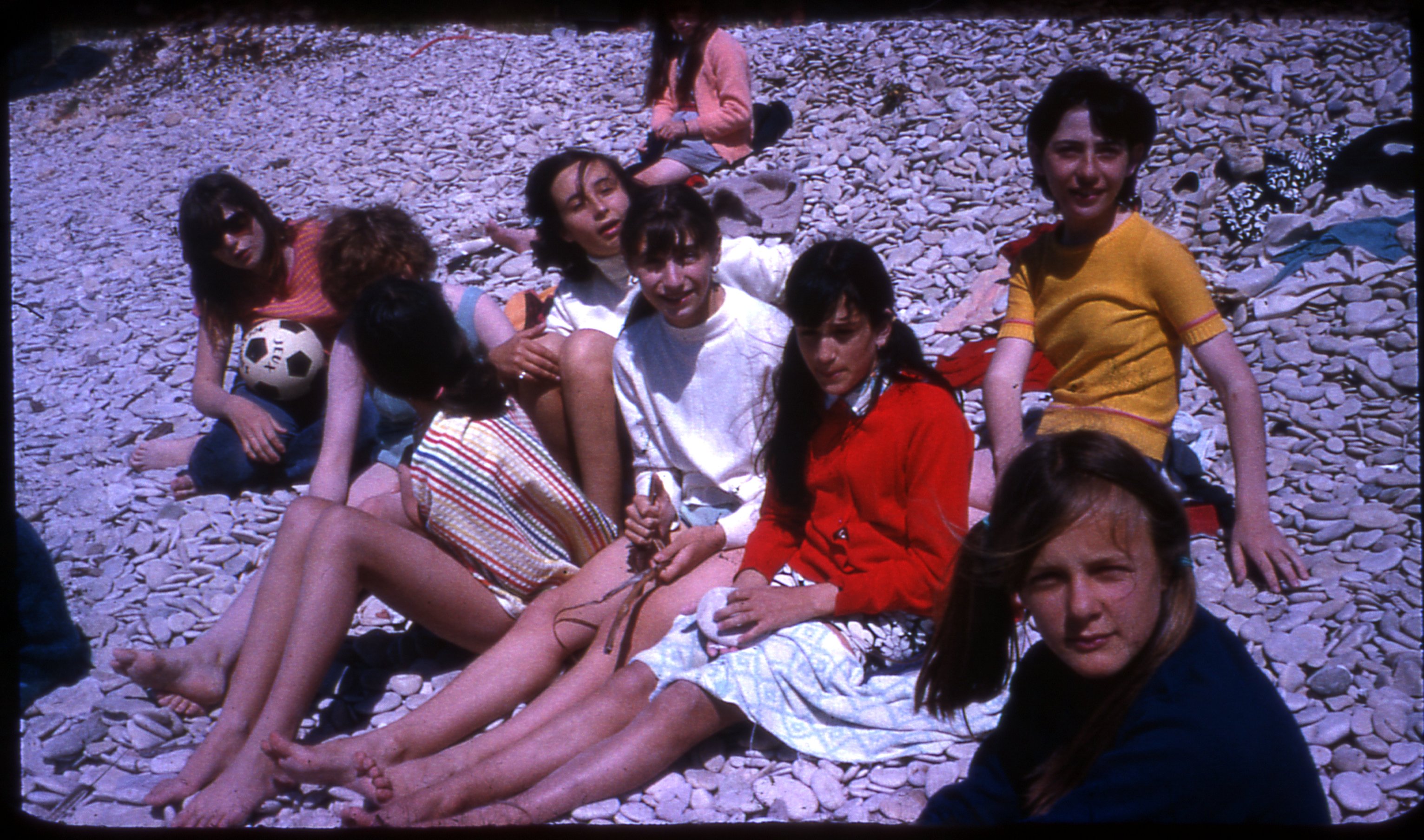 Des adolescentes assisent sur la plage de l'Houmeau en 1969