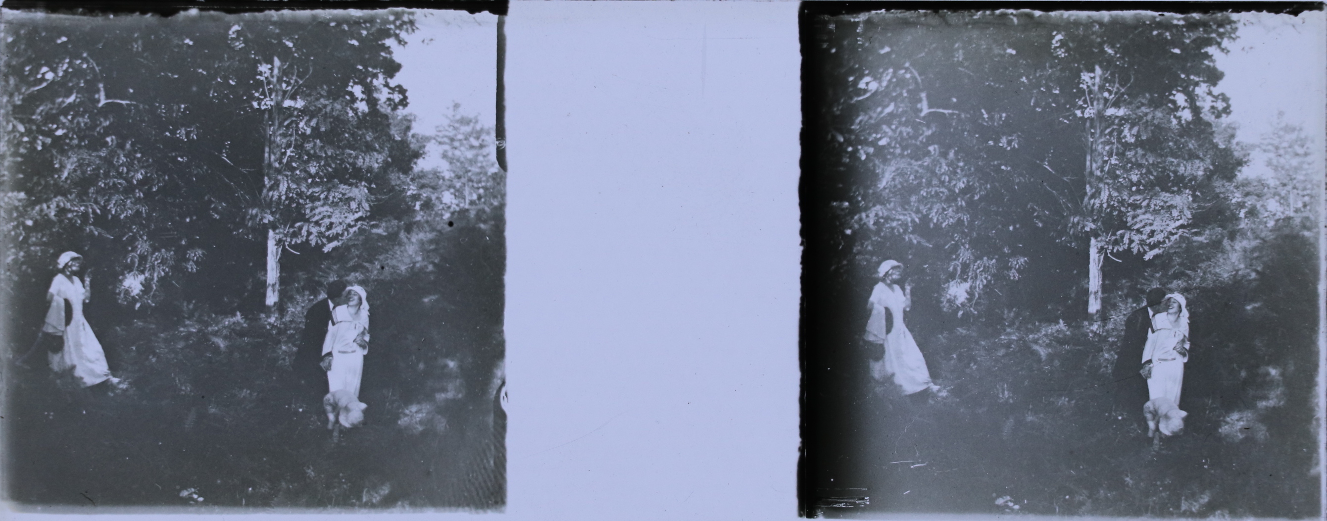 Tandis qu'une femme semble déambuler, un couple s'embrasse dans une forêt, dans les années 1920.