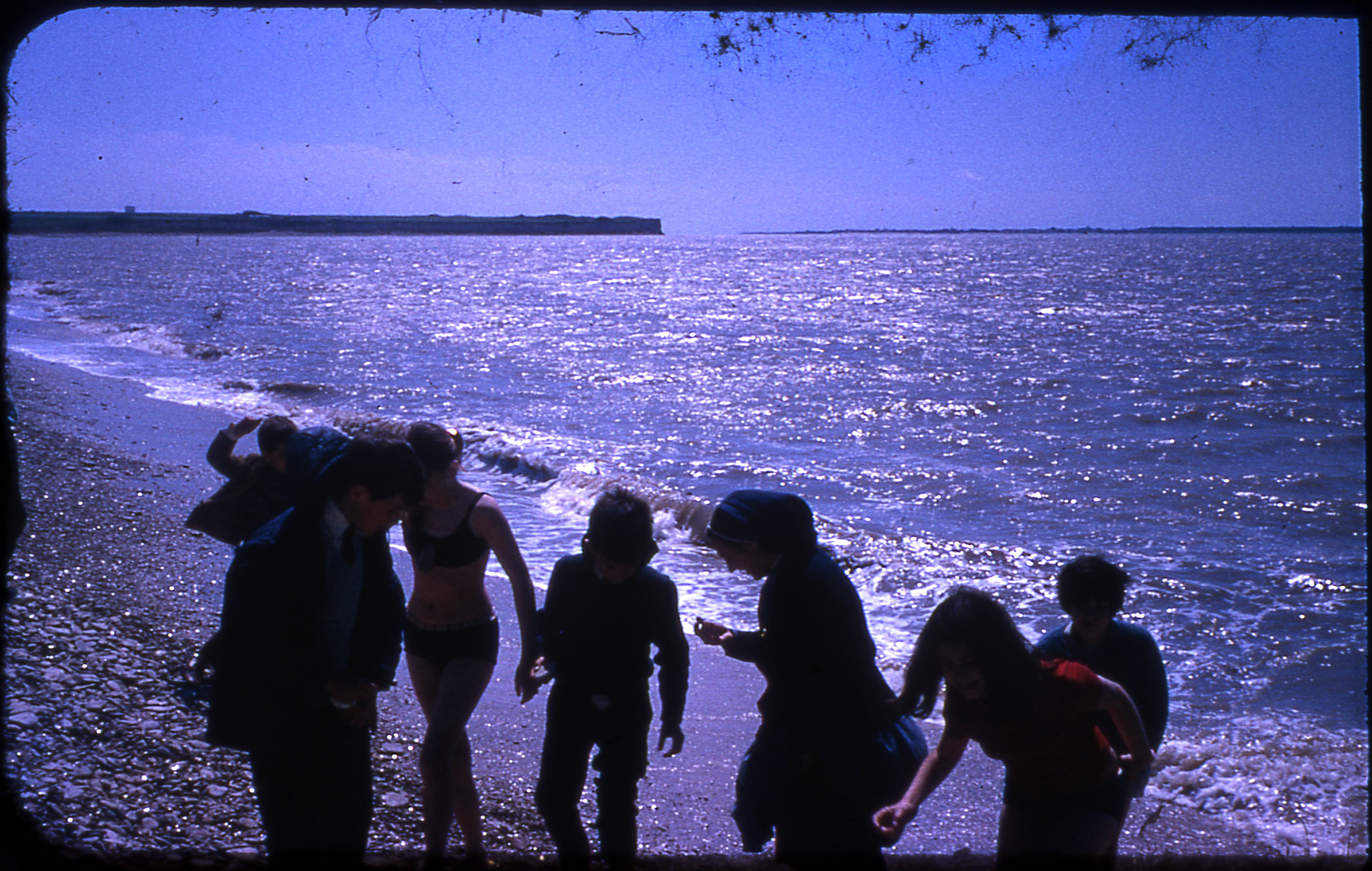 Des enfants et une bonne sœur sont sur la plage à l'Houmeau en 1969