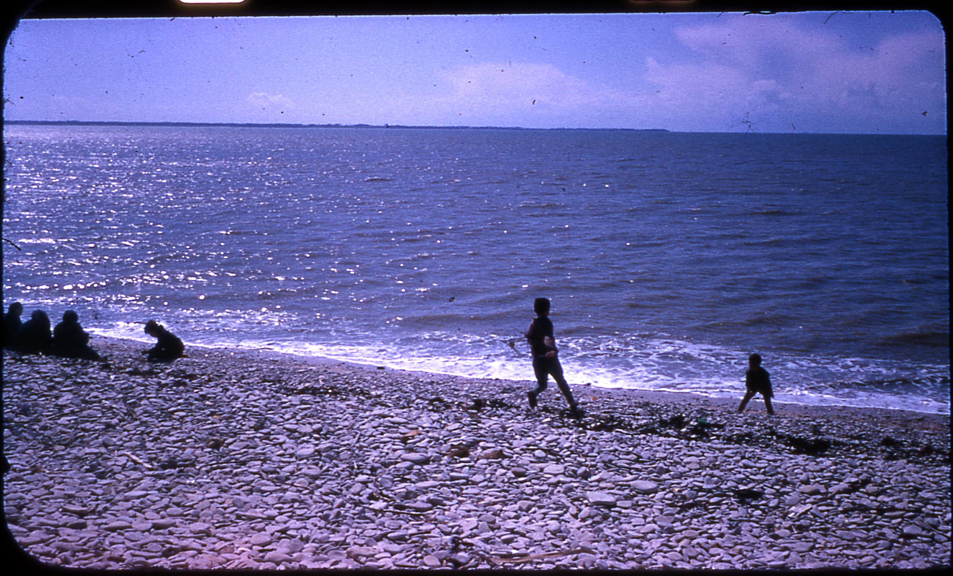 Des enfants jouent sur une plage de galets à l'Houmeau en 1969