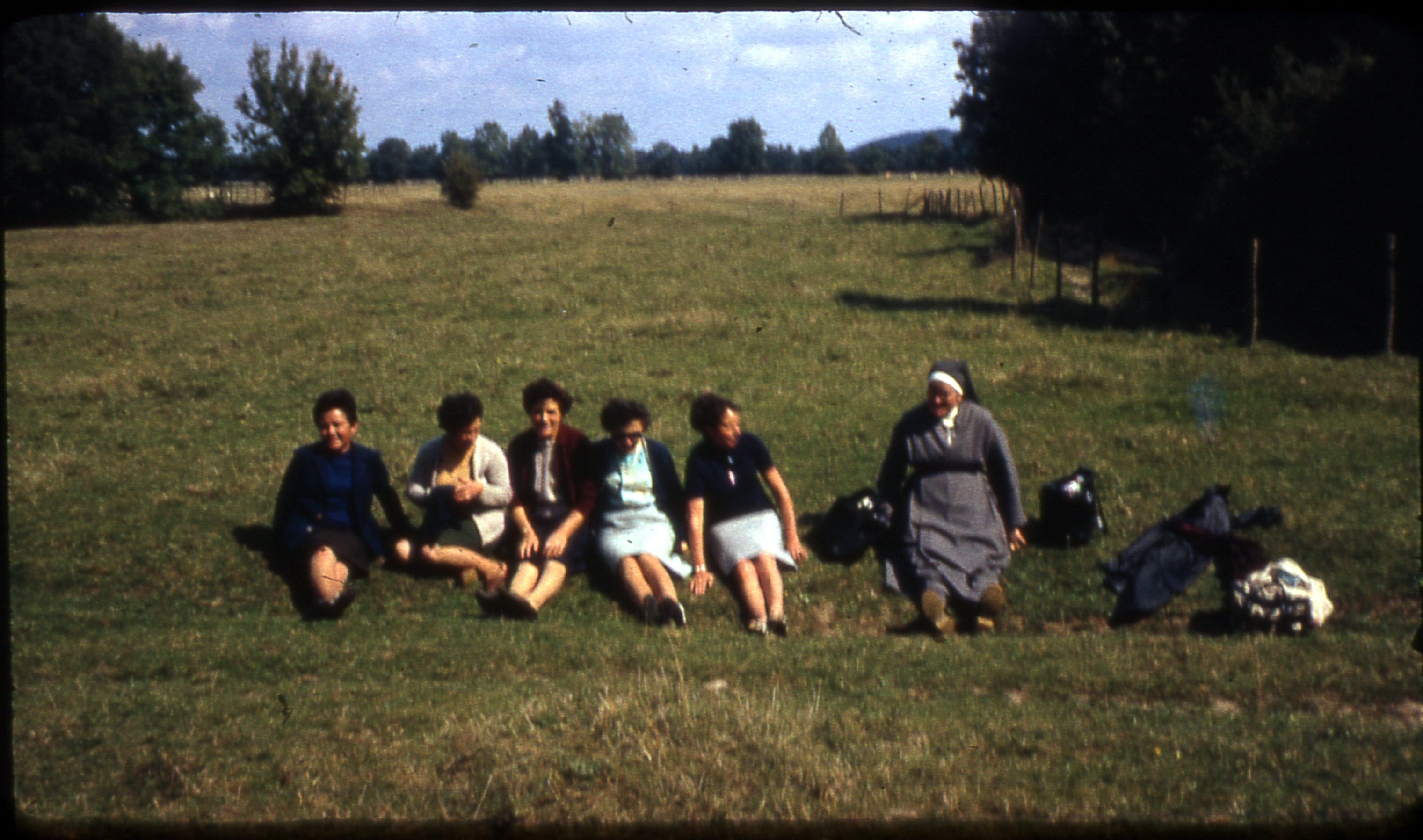 6 femmes sont assises dans l'herbe dont une religieuse en 1967.