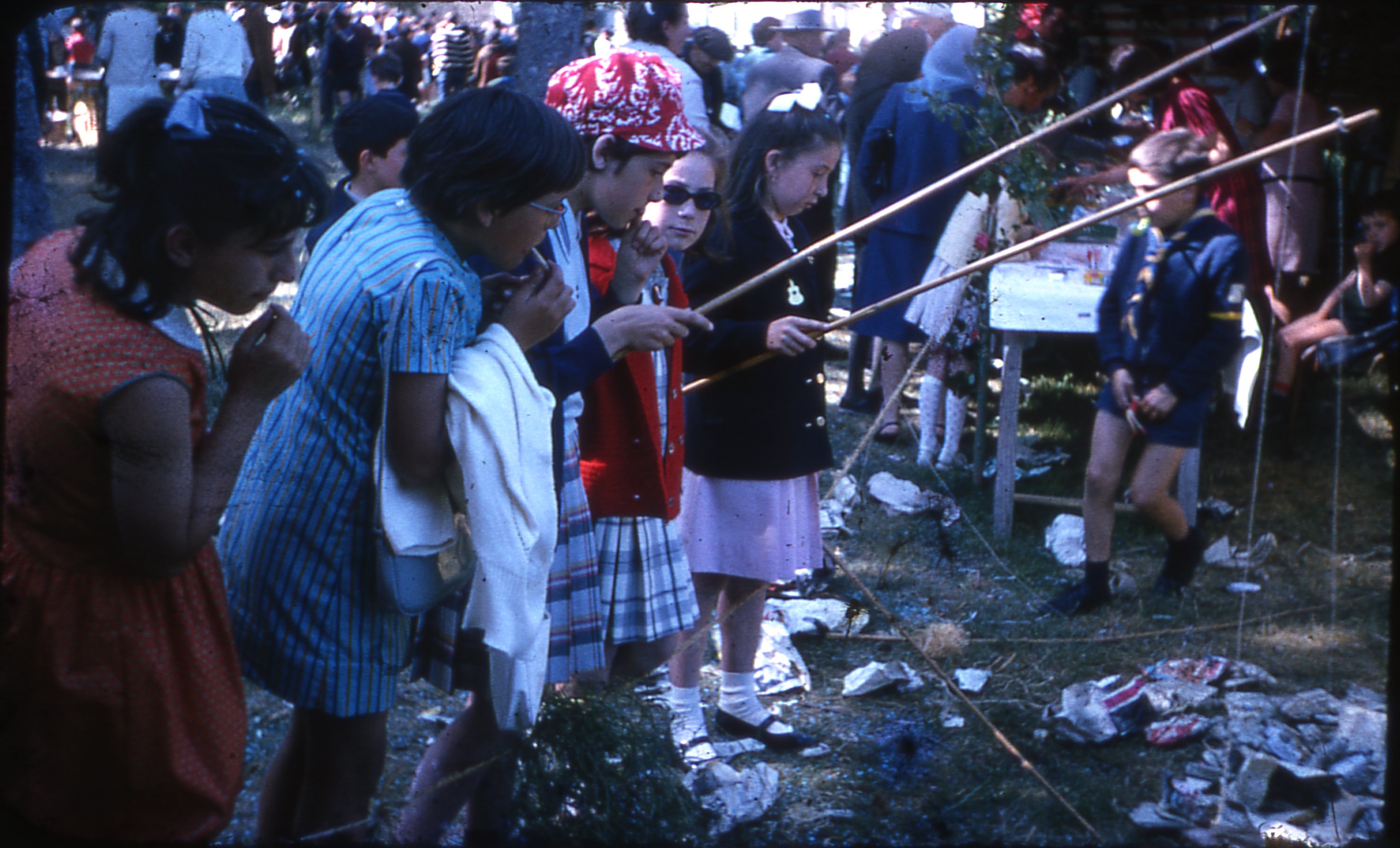Des filles jouent à la pêche à la ligne à une kermesse en 1966-1967.