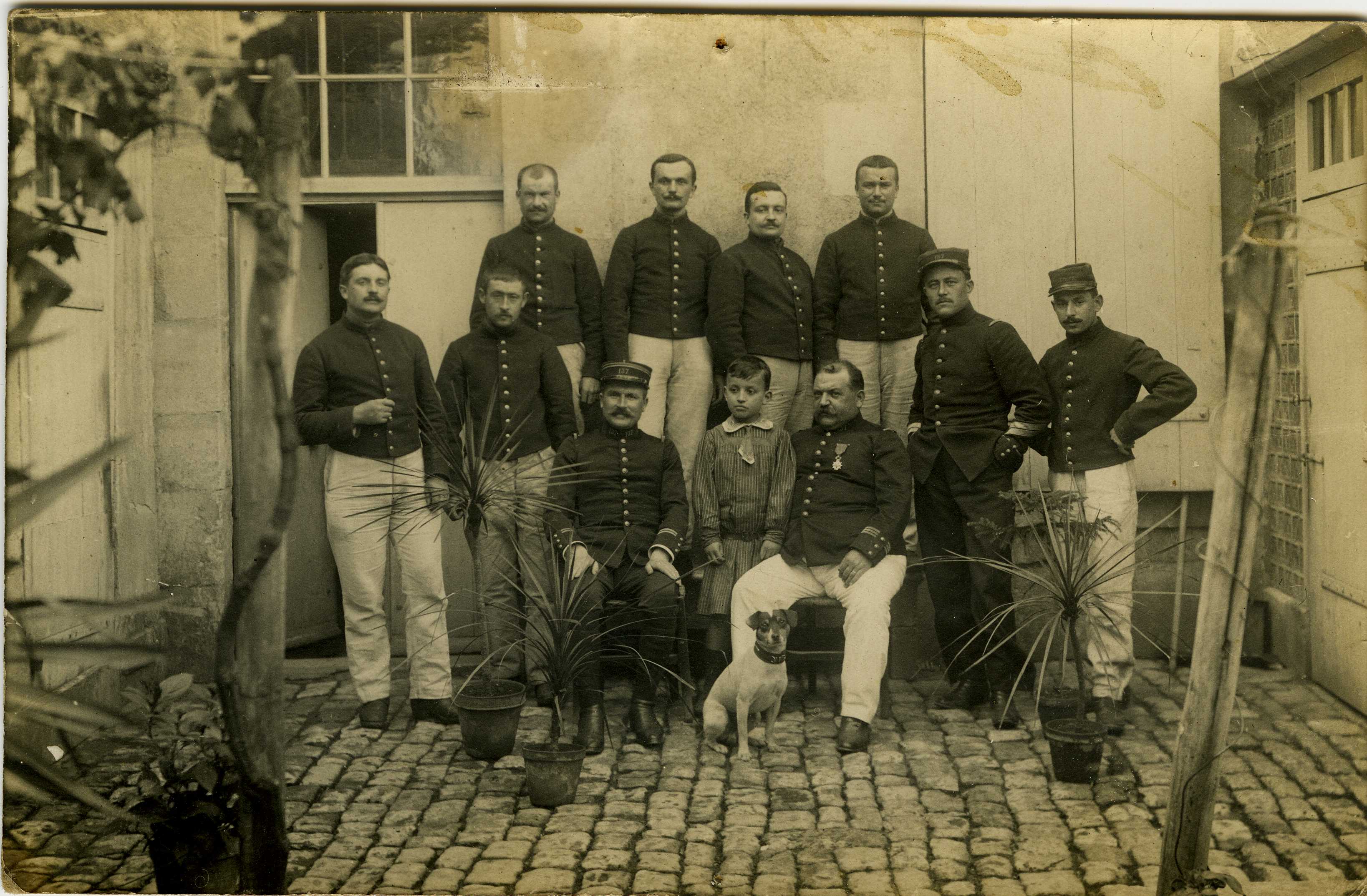 10 gendarmes posent dans une cour avec au centre un petit garçon et un chien.