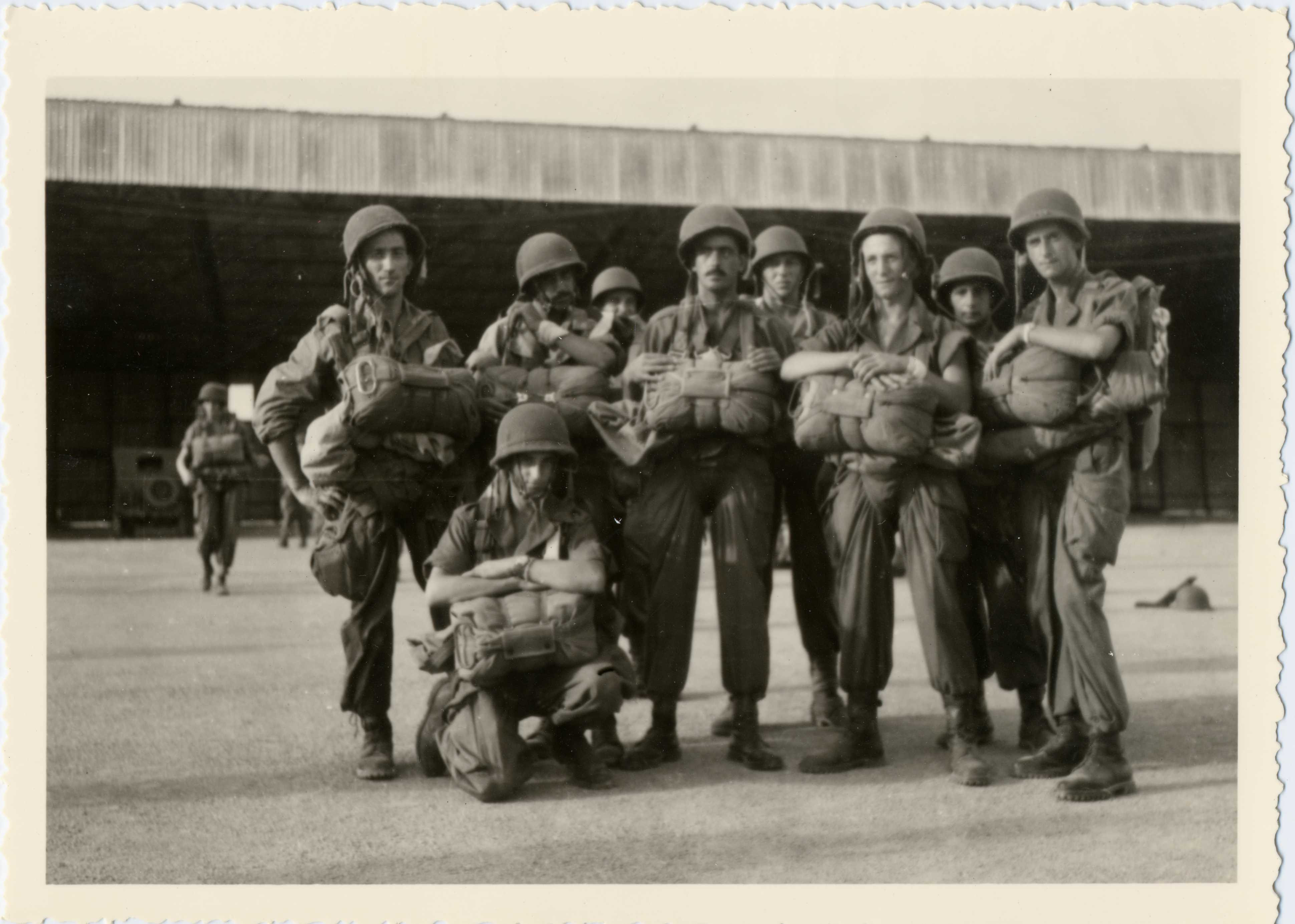Des parachutistes posent en tenue de combat avant un saut pendant la Guerre d'Indochine