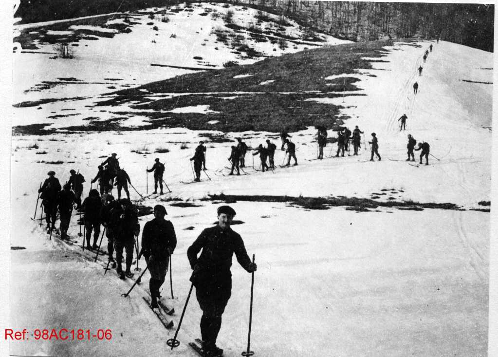 Des soldats se déplacent à ski, en formation, dans un paysage enneigé de montagne pendant la Première Guerre mondiale