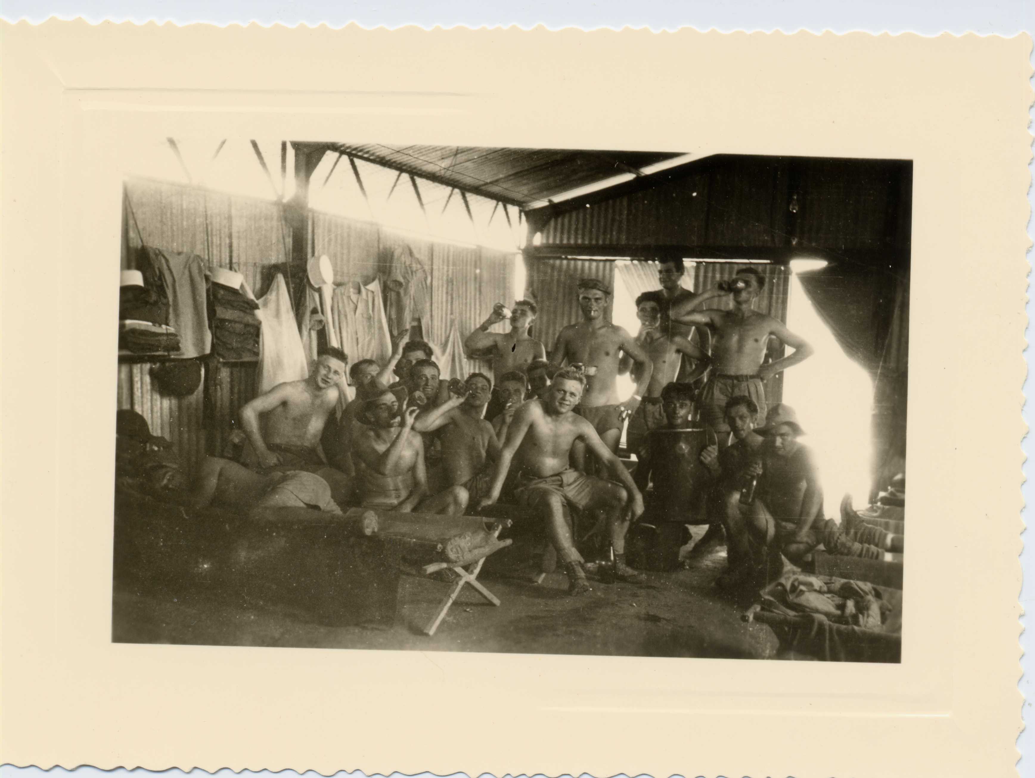 Des soldats sont dans une tente de leur campement. Certains boivent, d'autres fument. A gauche on aperçoit un homme couché sur un lit. Le 3ème homme debout à droite semble tenir une grande pièce de métal.
