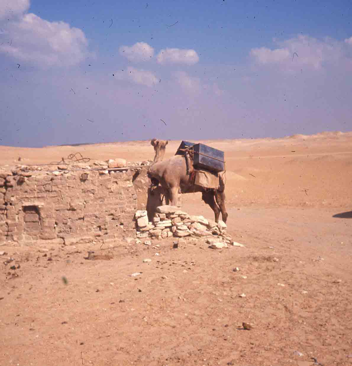 Photo prise par Georges de Caunes dans un lieu non déterminé. Désert, dromadaire au centre de la prise de vue.