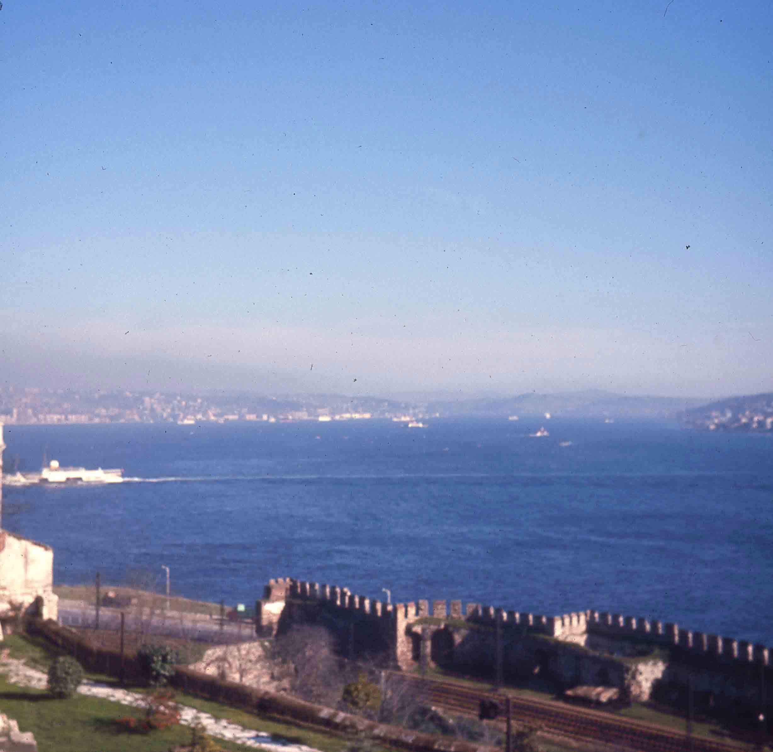 Photo du détroit de Bosphore, derrière une muraille en pierre, à Istanbul.