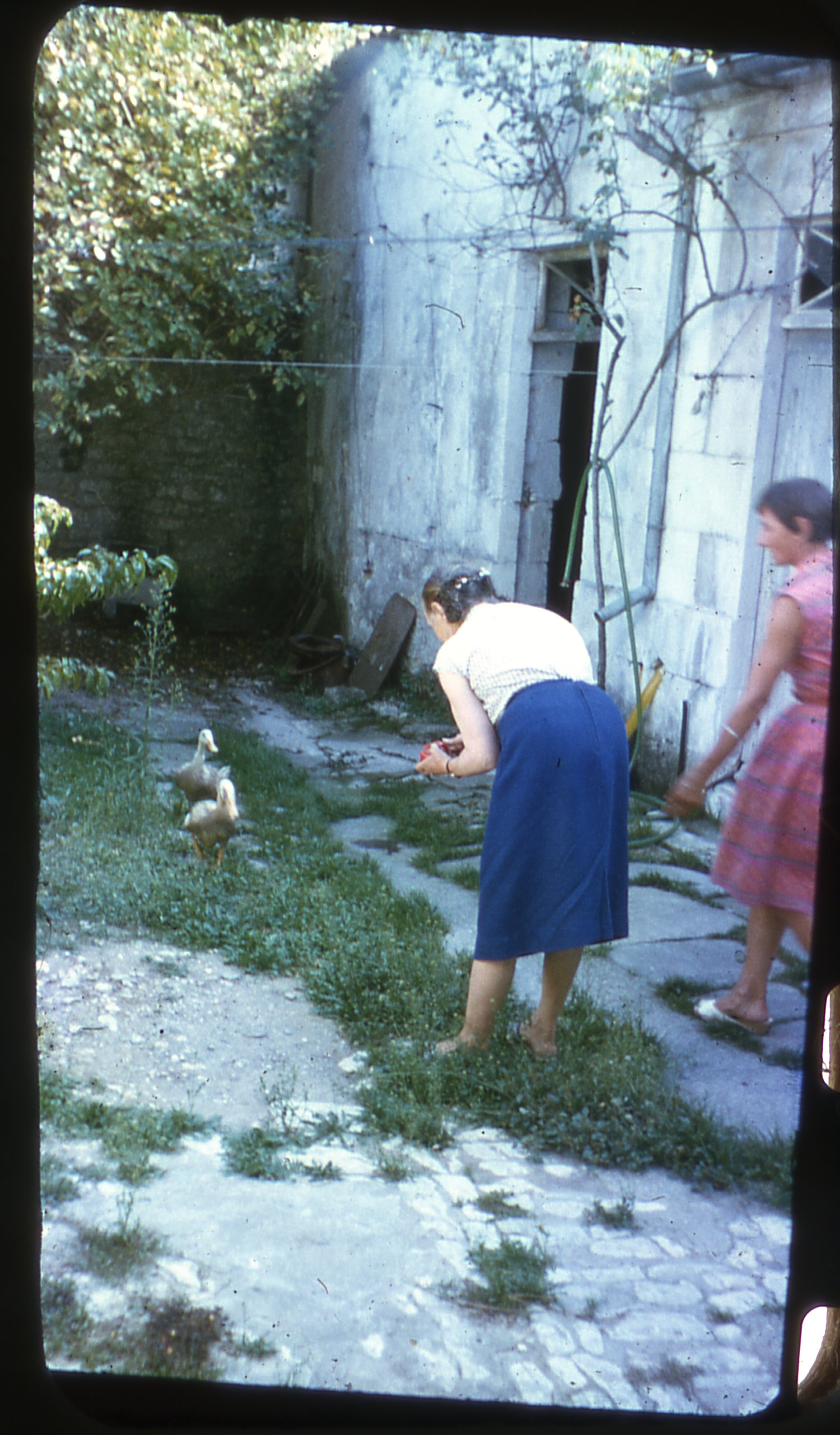 Deux femmes dans un jardin nourrissent des canards à Saint-Denis-d'Oléron dans les années 1950 à 1970