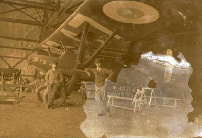 Deux hommes à côté d'un Nieuport-Delage NiD 622 dans un hangar