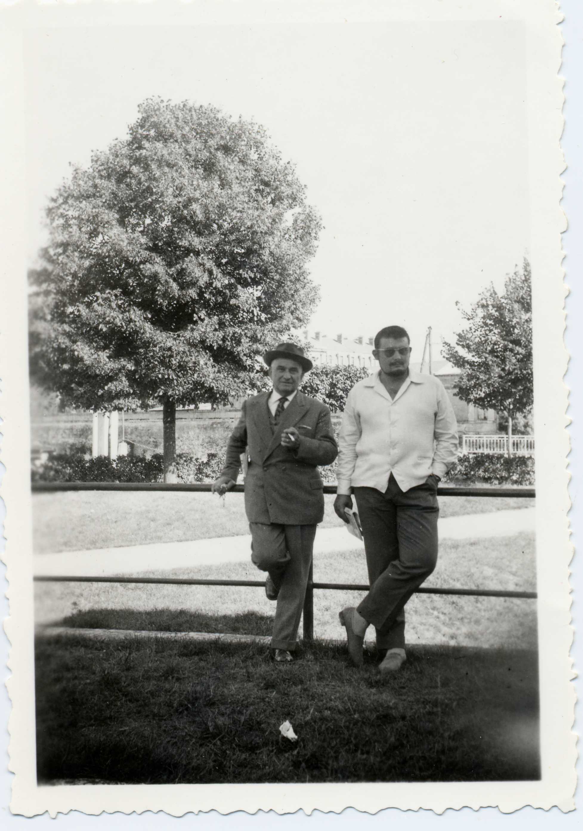 Deux hommes posent dans un espace vert. L'un porte un costume et fume une cigarette, le deuxième est en chemise.