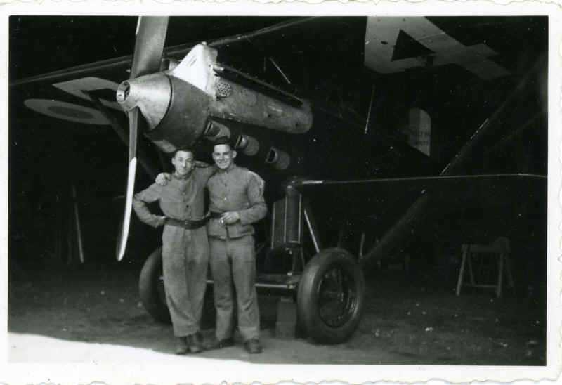 Deux militaires posent devant un avion monomoteur à hélice appareil des années 1920–1940