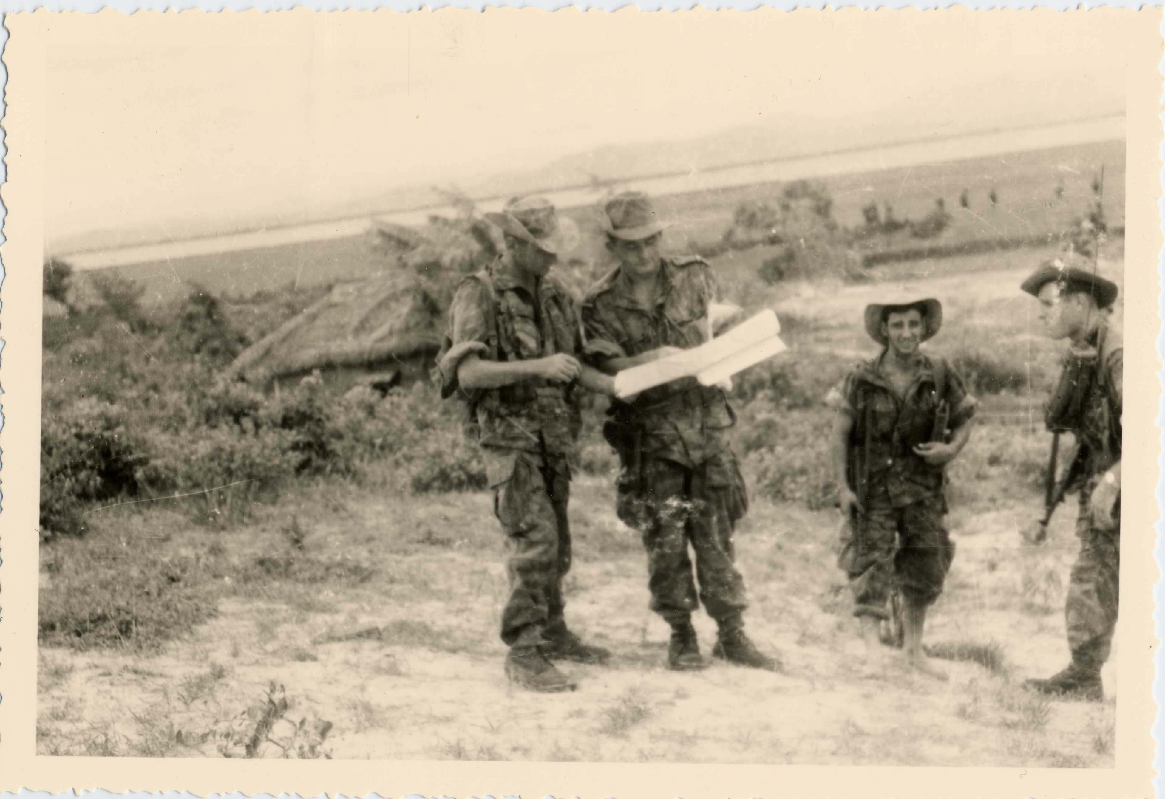 Deux officiers se repèrent sur une carte dans la campagne en Indochine. Des soldats les entourent.