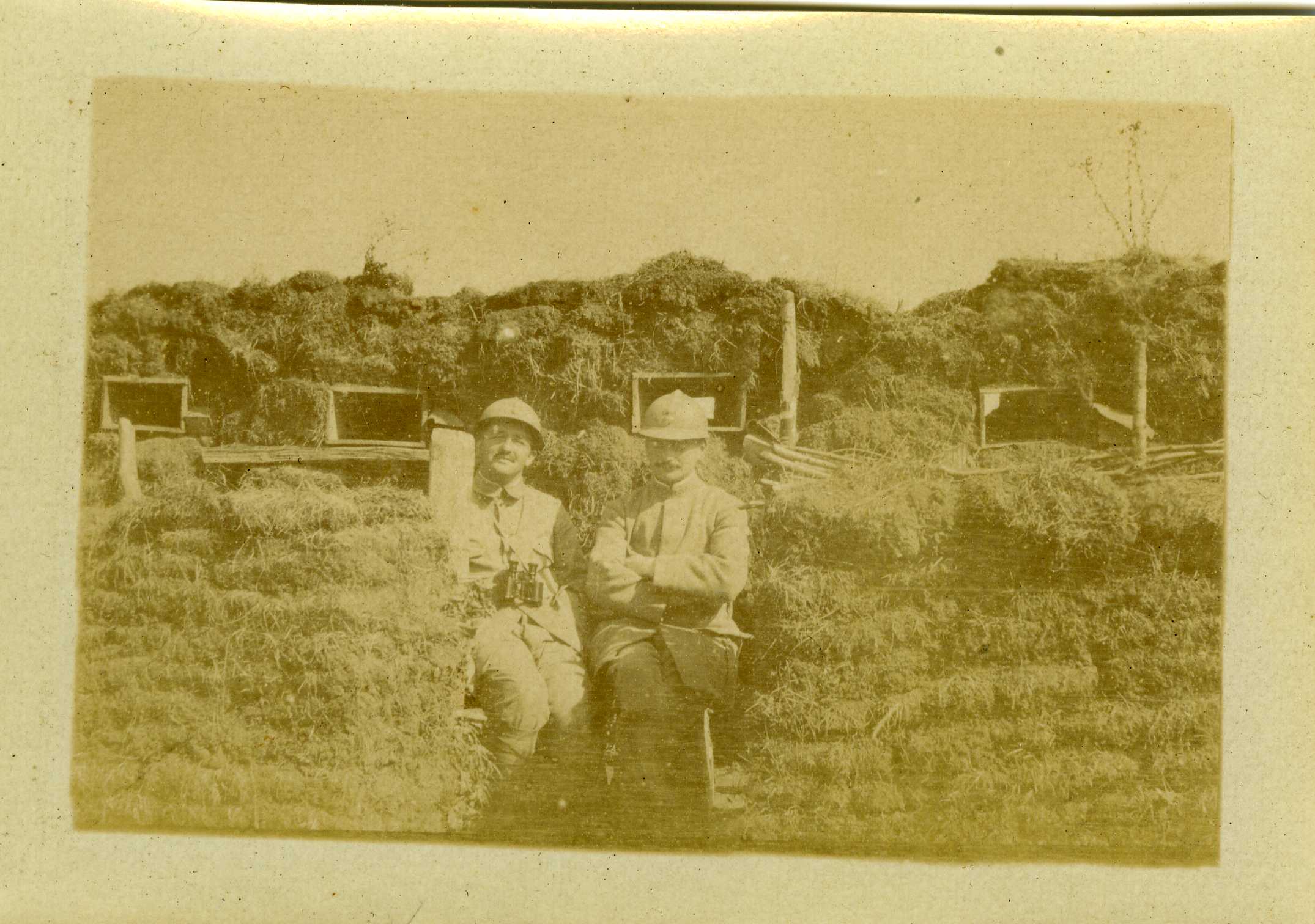 Deux soldats devant un abri ou un poste militaire camouflé pendant la Première Guerre mondiale