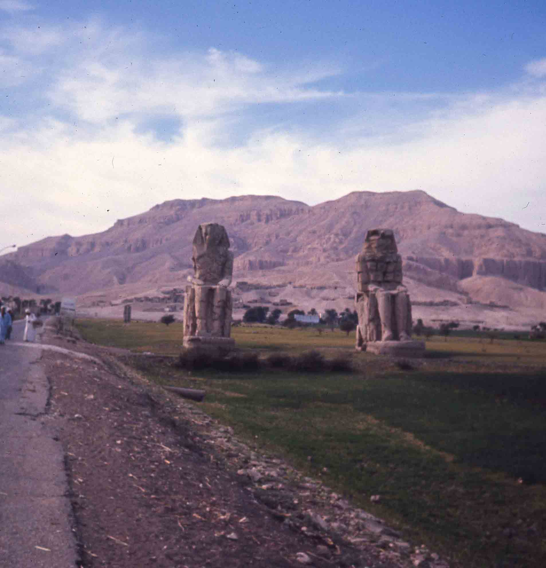Prise de vue des deux statues de la Vallée des Rois à Louxor. Montagnes derrière, on peut voir la Vallée.