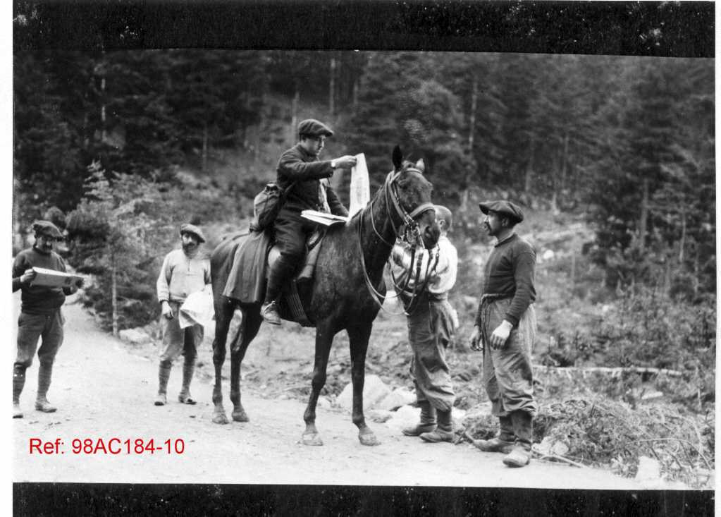 Distribution de journaux sur une route de campagne. Un homme à cheval distribue des journaux à des habitants (ou des soldats ?).