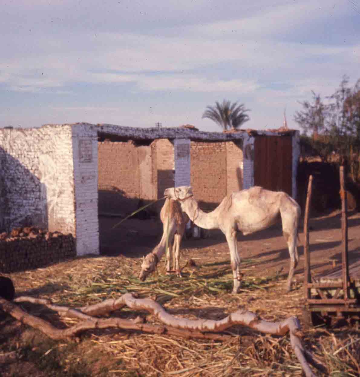 Photo prise en Égypte, dans un lieu inconnu. Dromadaires au premier plan, bâtiment au second.