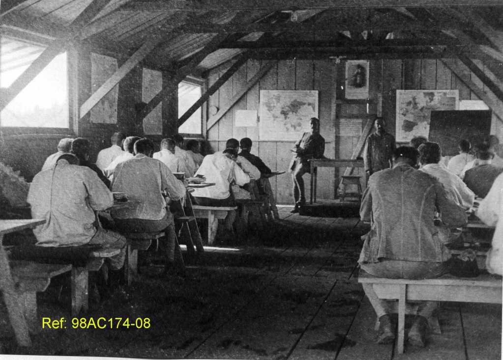 On y voit un instructeur debout près d’une table et des cartes murales derrière lui, utilisées pour l’enseignement.
