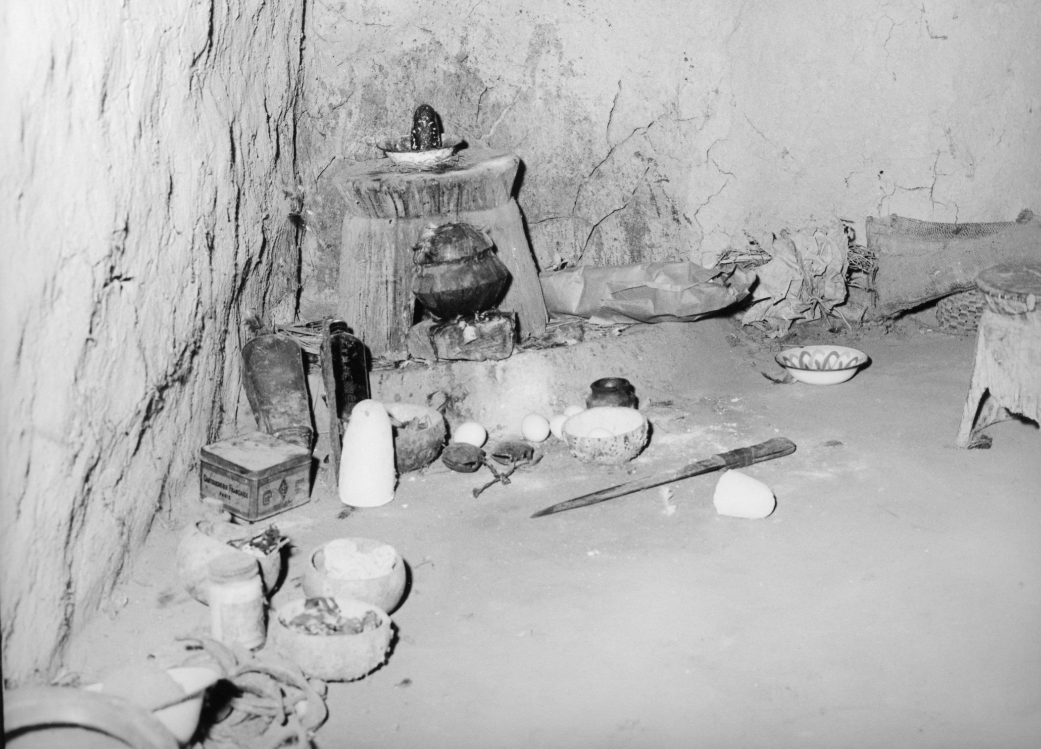 A l'intérieur d'une maison de Baoulés, dans le village d'Assoumvoué, en Côte d'Ivoire, en 1964.