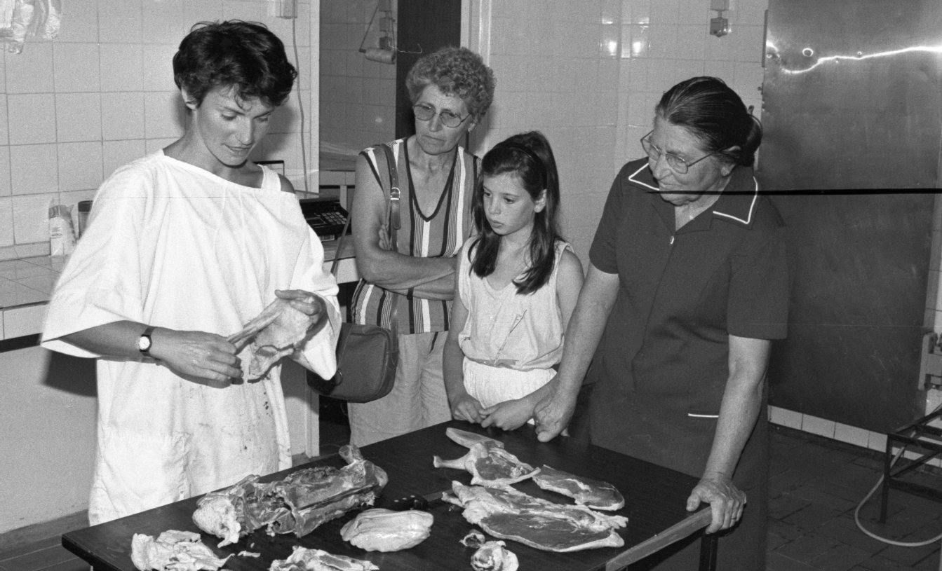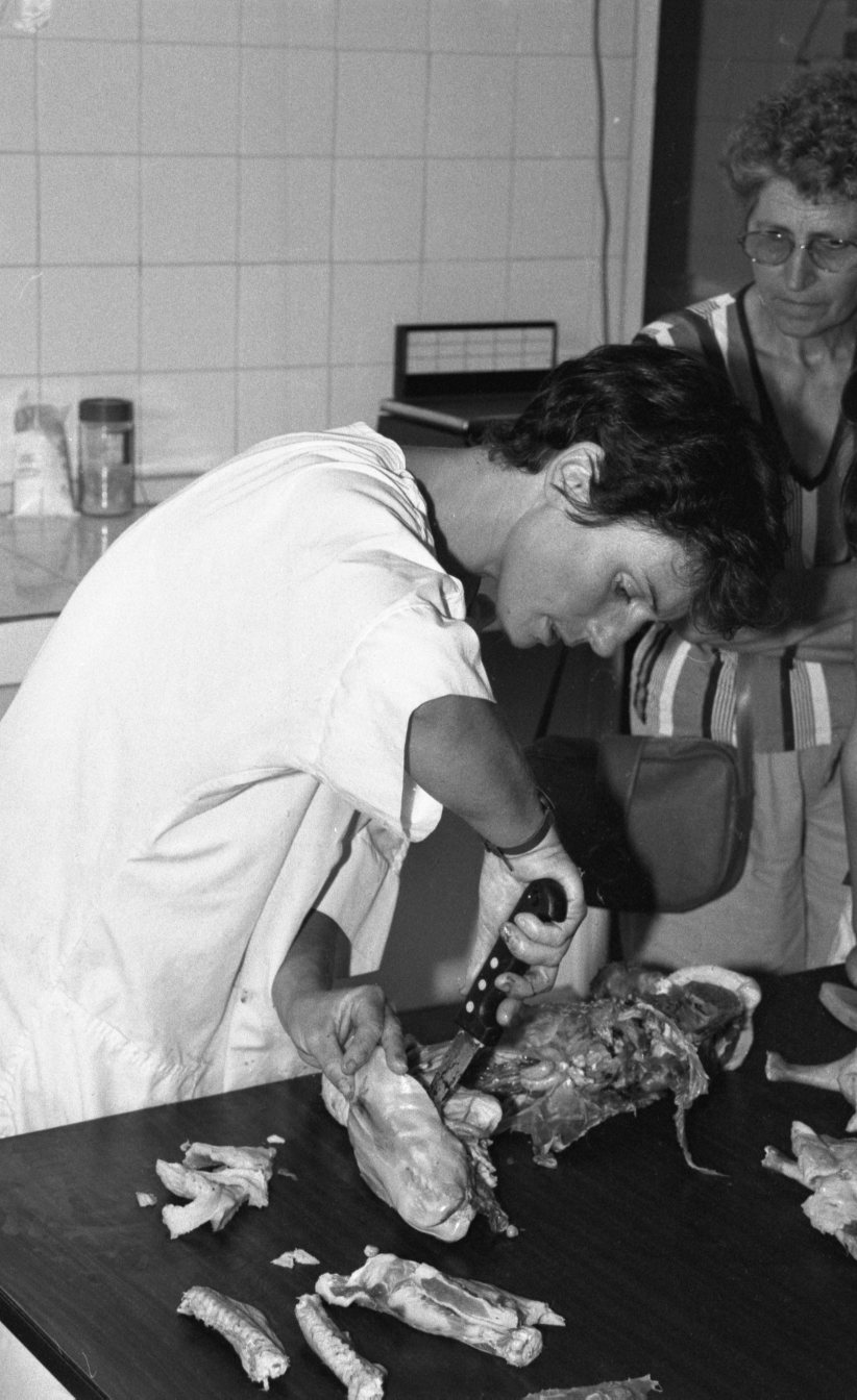 Une éleveuse fait une démonstration de découpe de canard dans son laboratoire en Haute-Vienne, en août 1991.