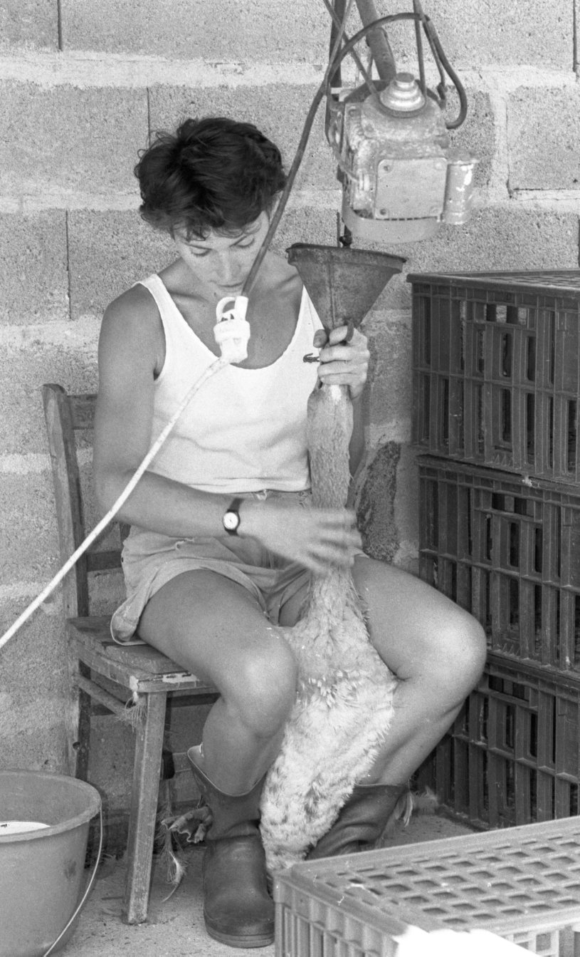 Une éleveuse pratique le gavage sur l'une de ses bêtes dans une ferme de Haute-Vienne, en août 1991.