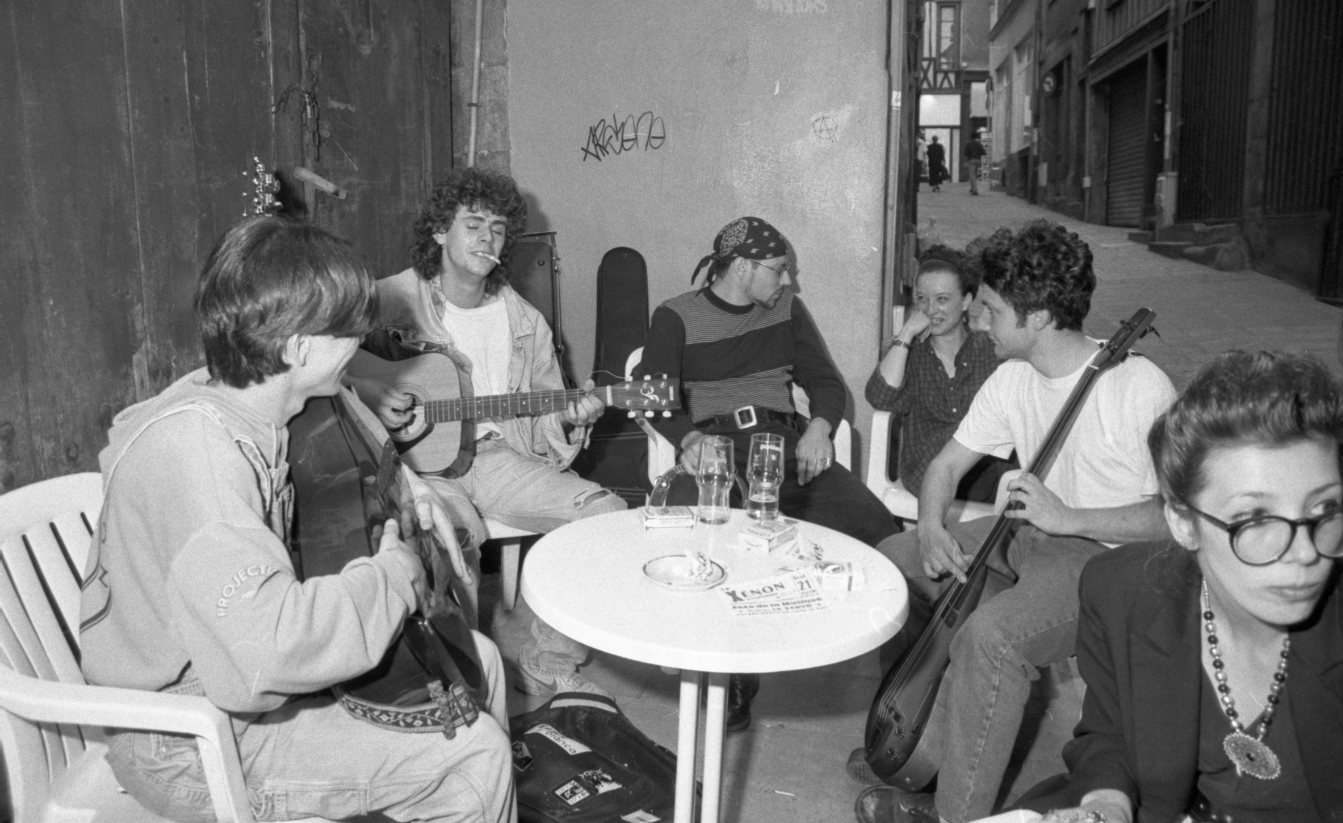 Attablés à la table d'un bar, rue du Temple à Limoges, des musiciens font un concert à l'occasion de la fête de la Musique, en juin 1991.
