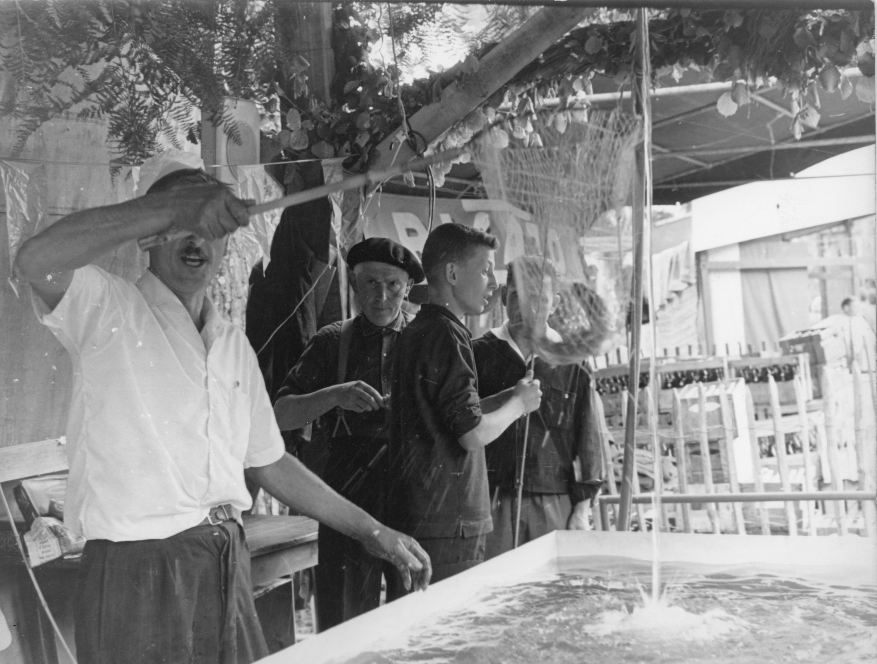 Derrière son stand de pêche aux poissons, le responsable sort fièrement une prise du bassin pendant la fête de L'Echo, assimilée plus tard à la fête du Mazeau, en juillet 1962 dans la commune haut-viennoise du Palais-sur-Vienne.