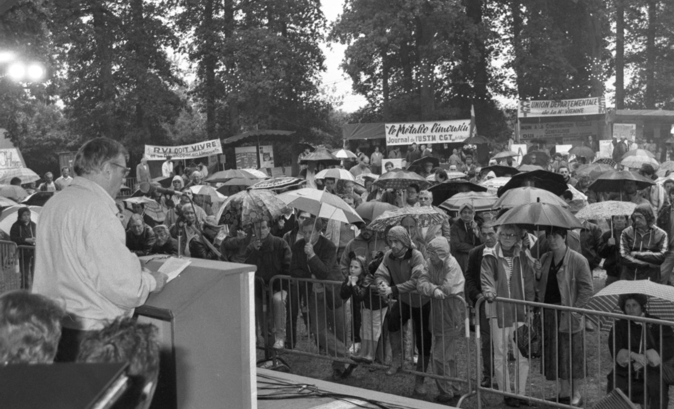 Malgré la pluie, Maurice Maron, Secrétaire fédéral du Parti Communiste Français de la Haute-Vienne, prononce un discours devant un public nombreux lors de la fête du Mazeau, à Saint-Priest-Taurion, en juin 1991.