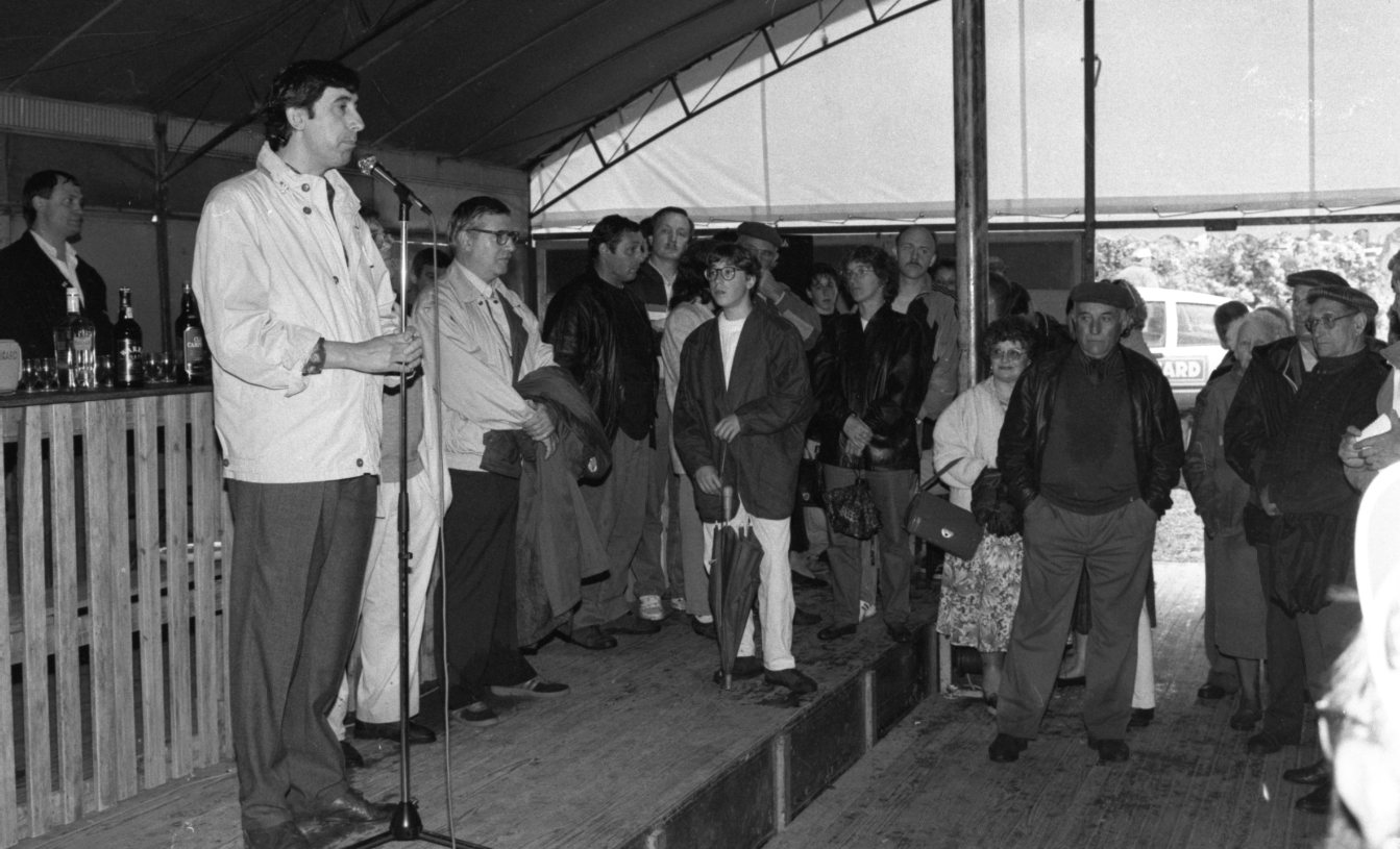 Christian Audouin, Directeur de rédaction du journal L'Echo, prononce un discours devant les Limougeauds et autres spectateurs, lors de la fête du Mazeau à Saint-Priest-Taurion, en Haute-Vienne, en juin 1991.
