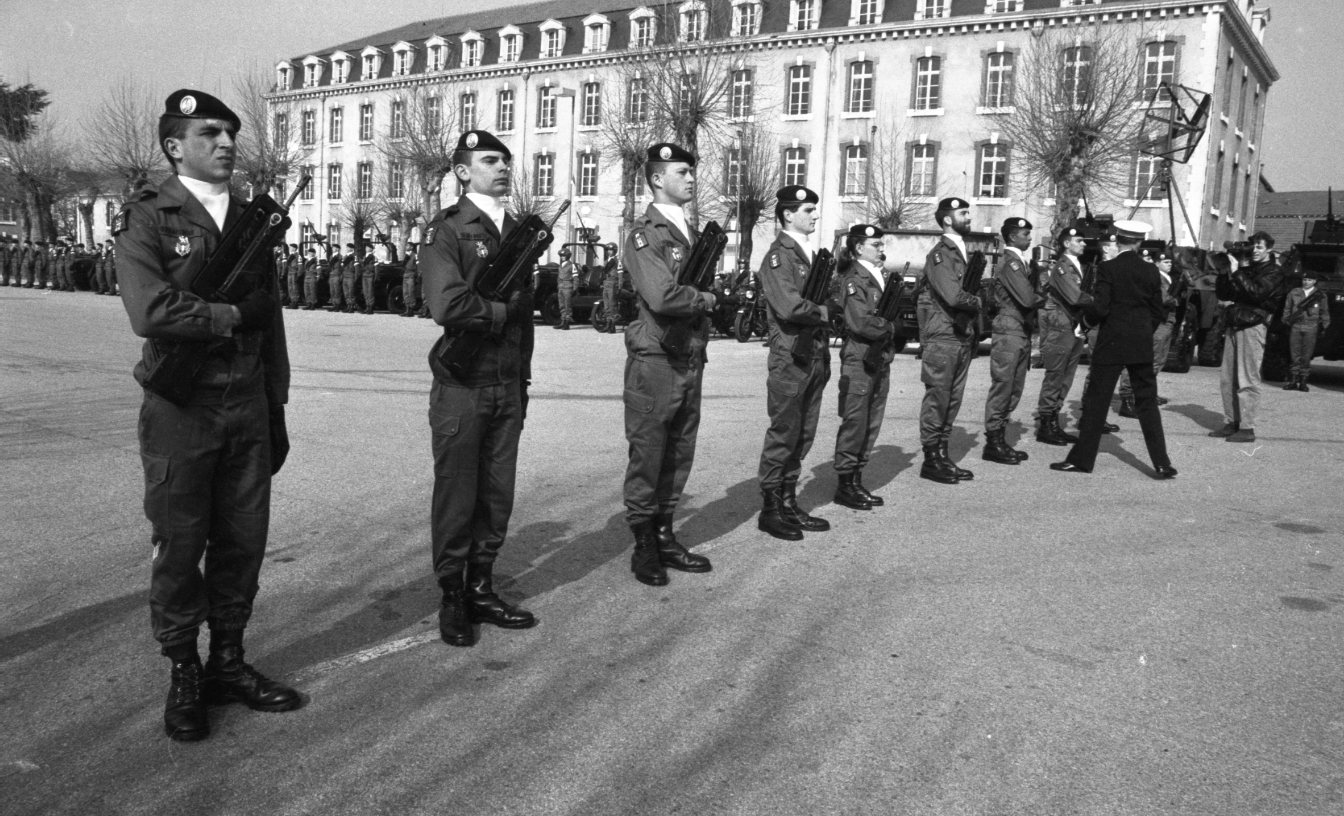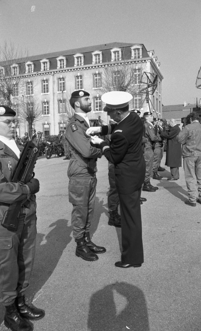 A Limoges, un officier remet des médailles à des des militaires dans la cour de la caserne Marceau lors de la fête de l'arme du Train ; unité de l'Armée de Terre en charge de la logistique et du transport, qui célèbre sa création, en mars 1991.