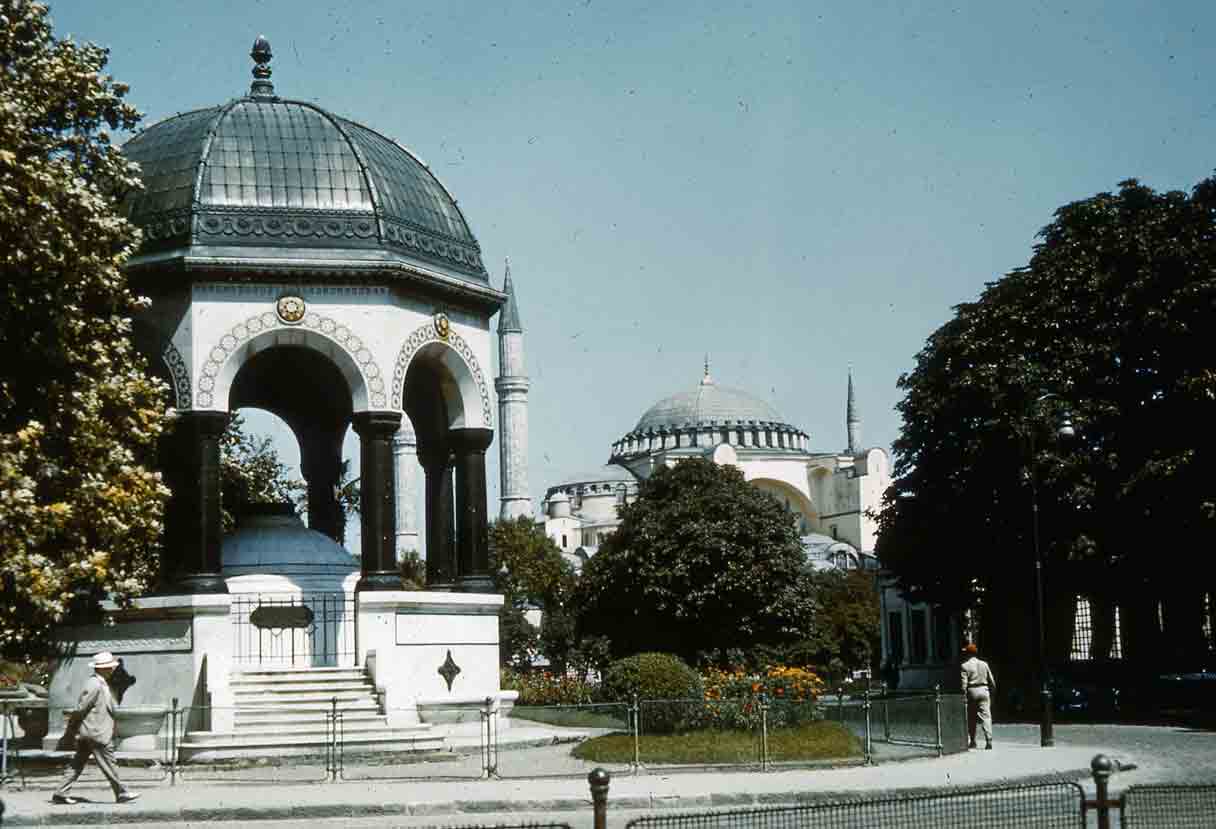 Photo de la Fontaine Allemande d'Istanbul. Passants, tournent autour, mosquée en arrière plan.