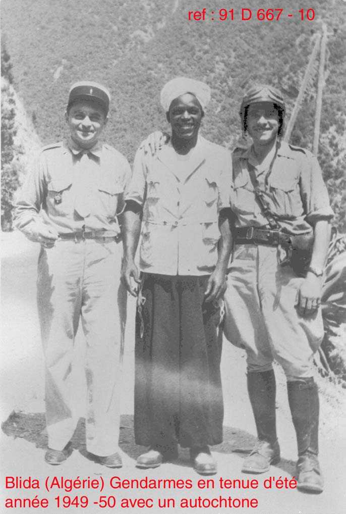 Gendarmes en tenue d'été posant avec un autochtone en 1949