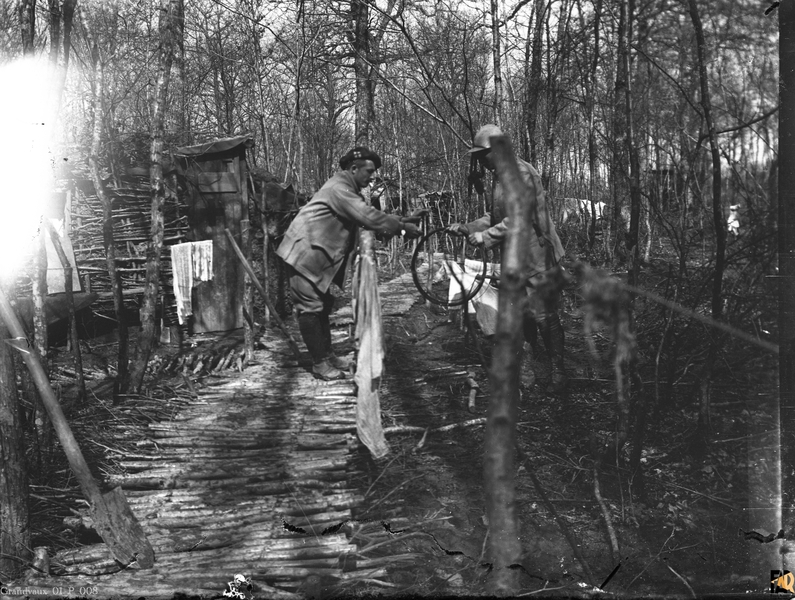 Deux soldats dans un campement militaire en forêt, casemates en bois et chemin en rondin de bois, pose des barbelés en Lorraine entre 1914 et 1916.
