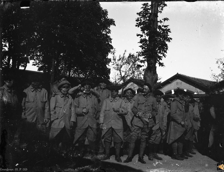 Groupe de soldats avec des masques à gaz en Lorraine entre 1914 et 1916 - Bâtiment à l'arrière