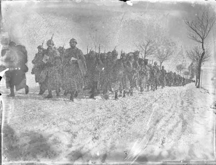 Troupe de miltaires en marche sur une route dans la neige en Lorraine entre 1914 et 1916