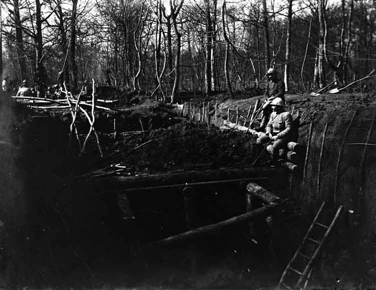 Soldats au bord d'une tranchée dans les bois en Lorraine pendant la Première Guerre mondiale