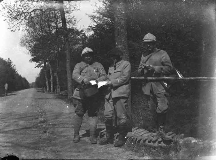 Trois chasseurs alpins au bord d'une route forestière en Lorraine pendant la Première Guerre mondiale
