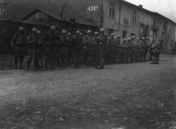 Militaires en ligne le long d'une route devant le Café de Lorraine - Lorraine entre 1914 et 1916