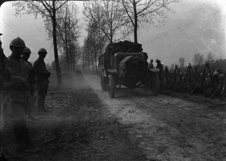 Camion militaire sur une route de Lorraine avec des troupes stationnées de chaque côté pendant la Première Guerre mondiale