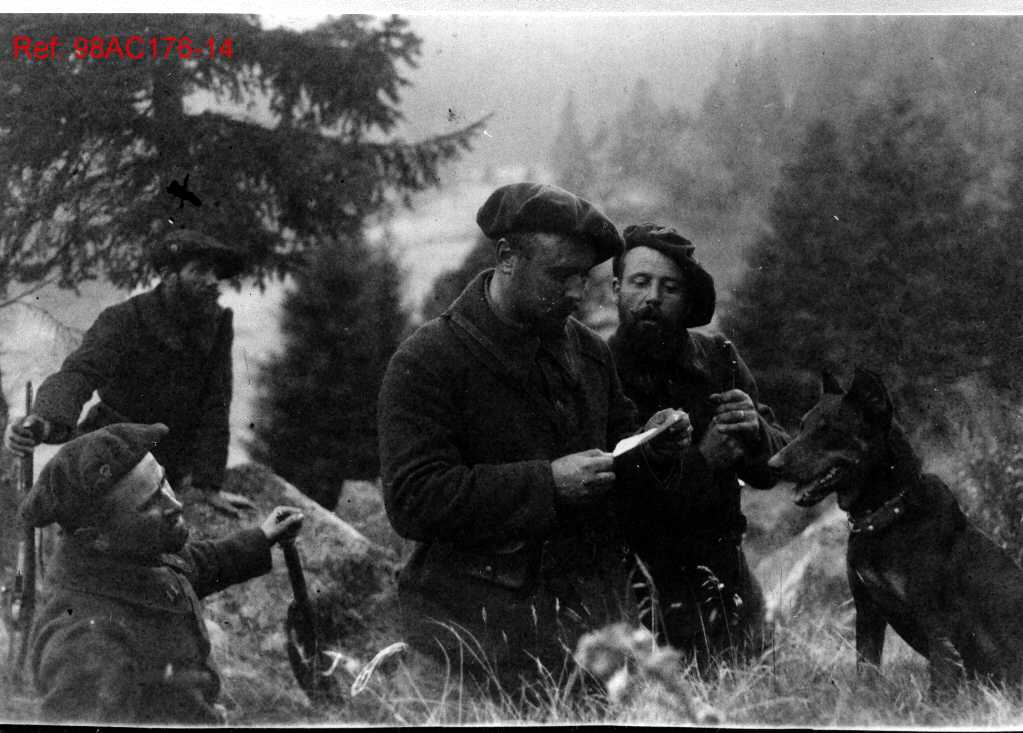 Groupe d’hommes armés en forêt ou en montagne. Ce groupe semble être des maquisards, c’est-à-dire des résistants français durant la Seconde Guerre mondiale.
