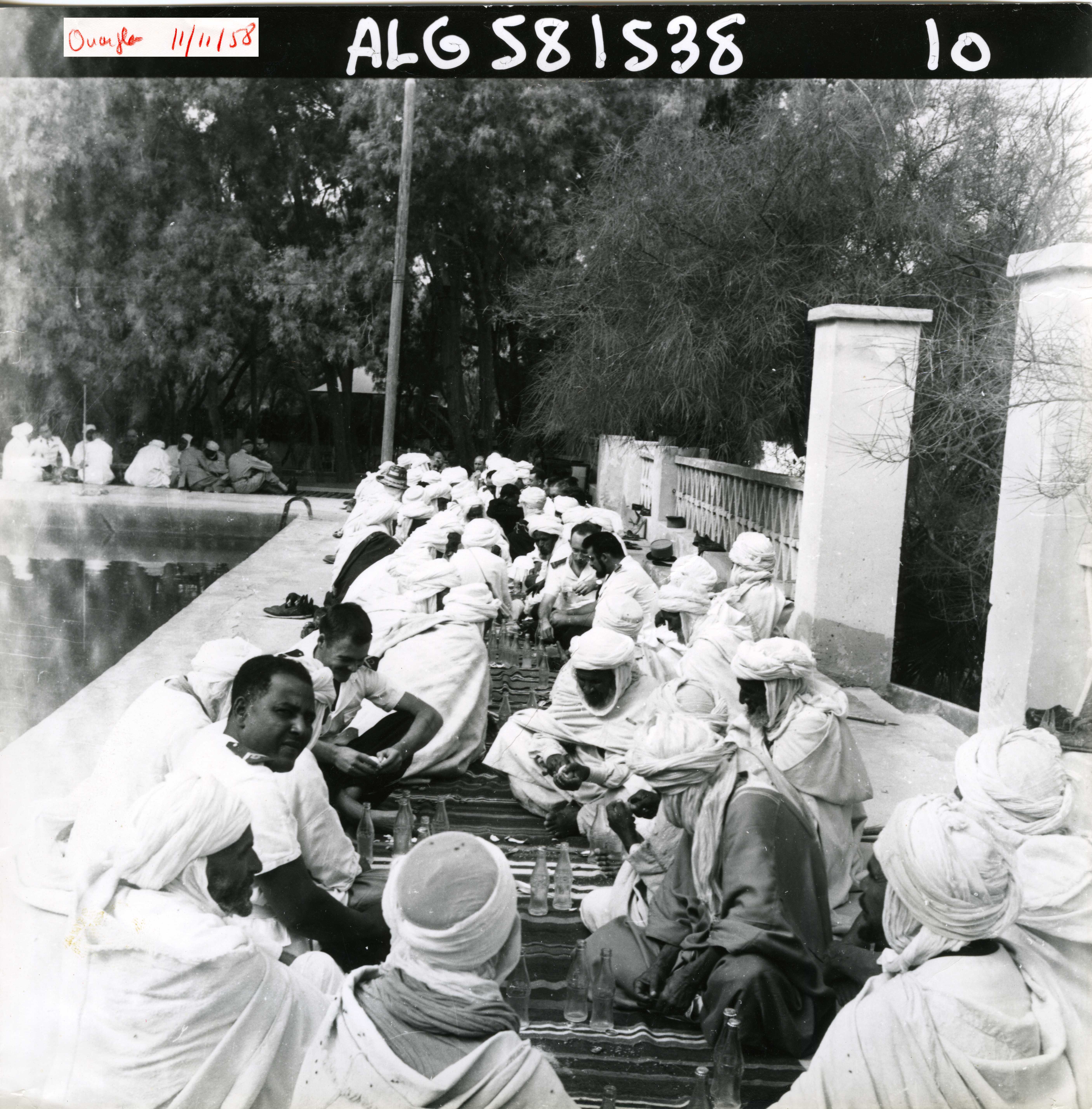 Groupe d'hommes en costume traditionnel buvant ensemble près d'un bassin. On distingue parmi eux un militaire français. La photo est prise à Ouargla en Algérie.