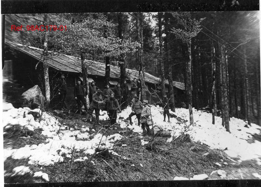 Groupe d’hommes en tenue militaire rassemblés dans une forêt enneigée, devant un long bâtiment en bois.