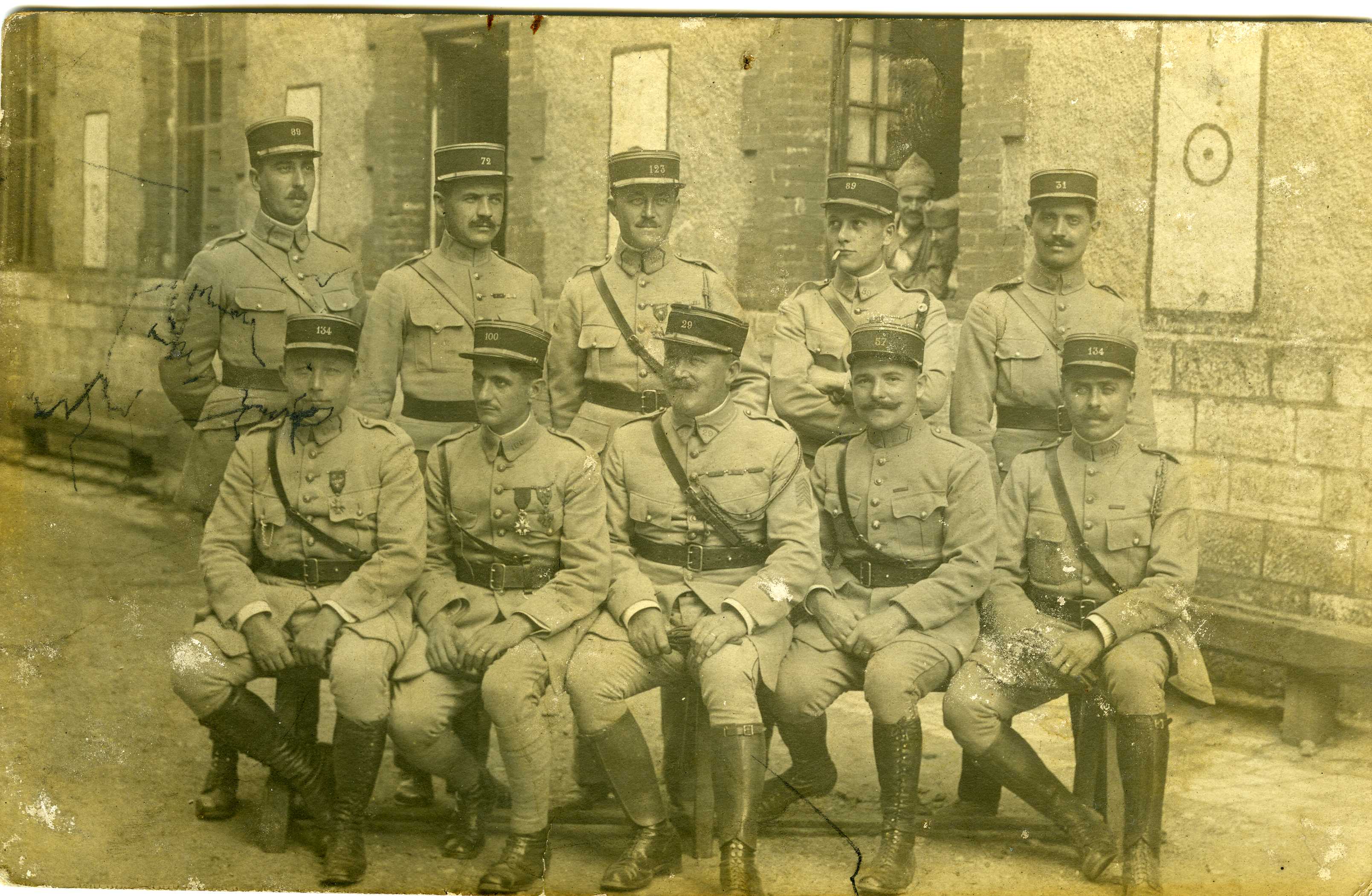 10 officiers français posent dans une cour d'une caserne. Sur le bandeau du képi, on voit les numéros de régiments.