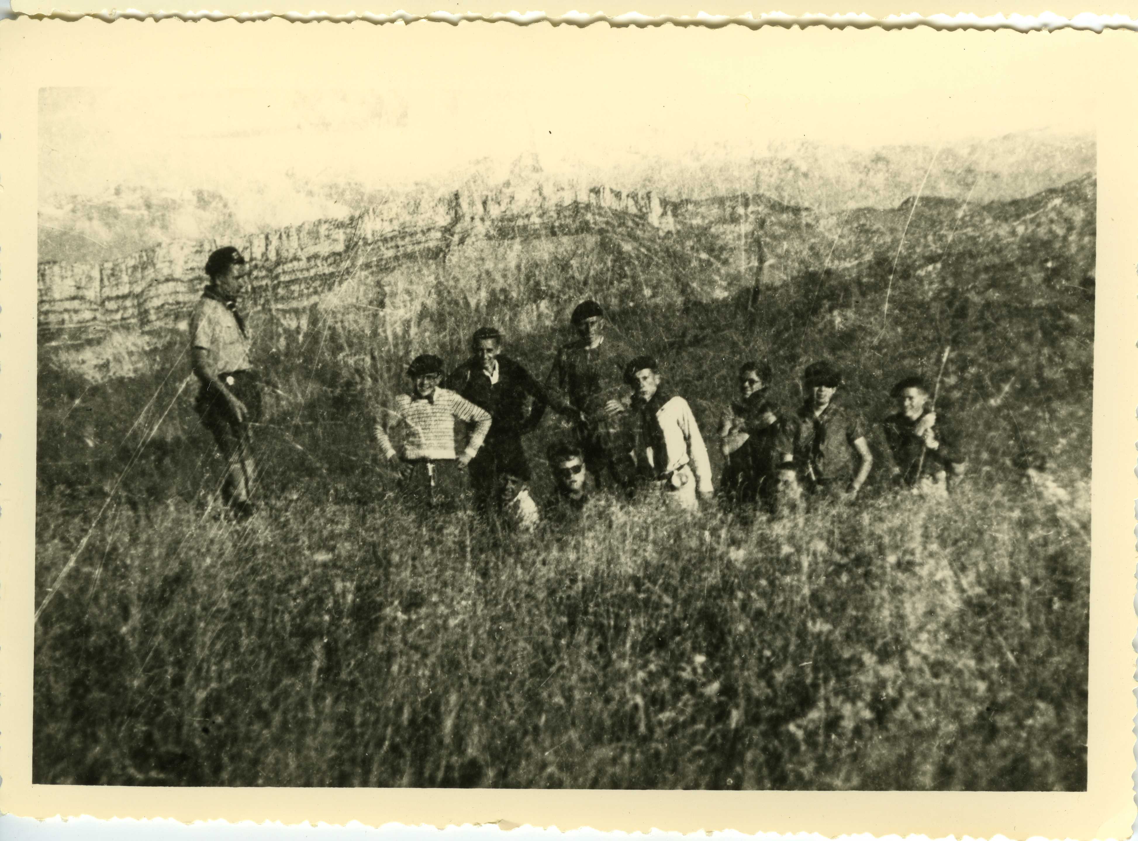 Groupe de jeunes posant dans un paysage rural ou montagneux.