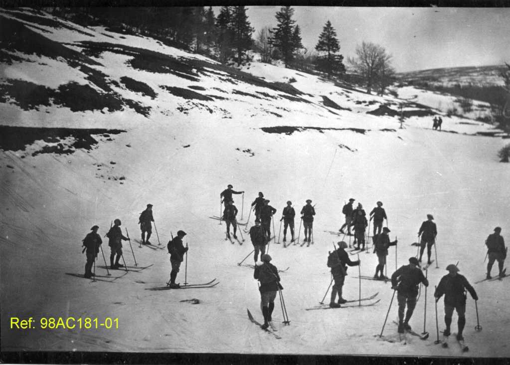Ils portent des fusils en bandoulière. Les skis servaient à se déplacer rapidement sur la neige, transporter du matériel et surprendre l’ennemi dans des zones difficiles d’accès.