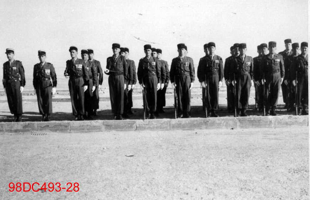Groupe de militaires en tenue, alignés au garde-à-vous lors d’une revue ou d’une cérémonie. Elle a sans doute été prise en Algérie.