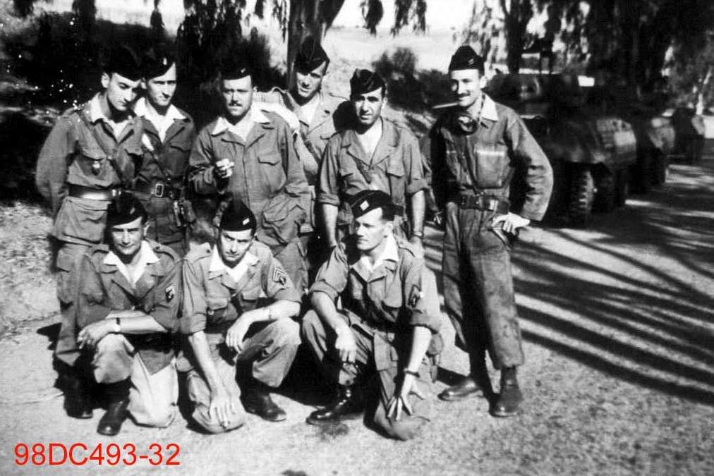 Neuf soldats en uniforme posent sur une route. En arrière plan, on trouve plusieurs véhicules militaires.