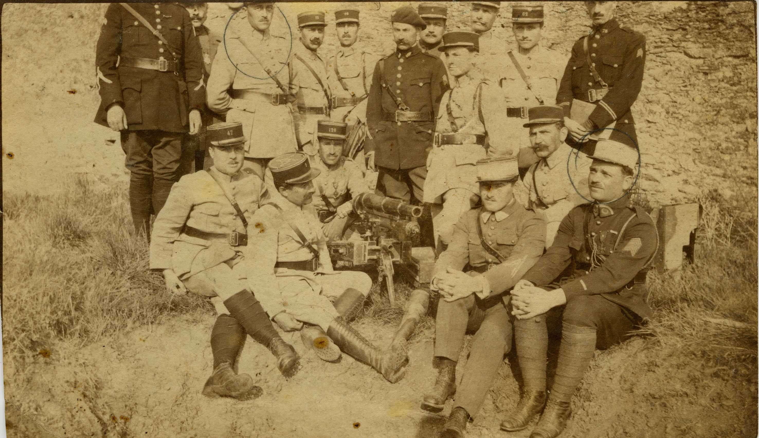 Groupe de soldats et de gendarmes à côté d'une mitrailleuse pendant la Première Guerre mondiale.